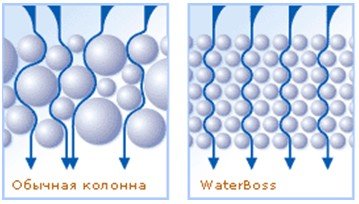 В умягчителях WaterBoss используется монодисперсная смола с диаметром гранул около 0,2 мм. Благодаря малому размеру гранул и отсутствию различий в их размере, сорбционная среда обладает очень низким гидродинамическим сопротивлением и высокой скоростью ионообменной реакции. Использование подобной ионообменной смолы в обычных насыпных колоннах невозможно в силу конструкции. Эффективная регенерация солью.